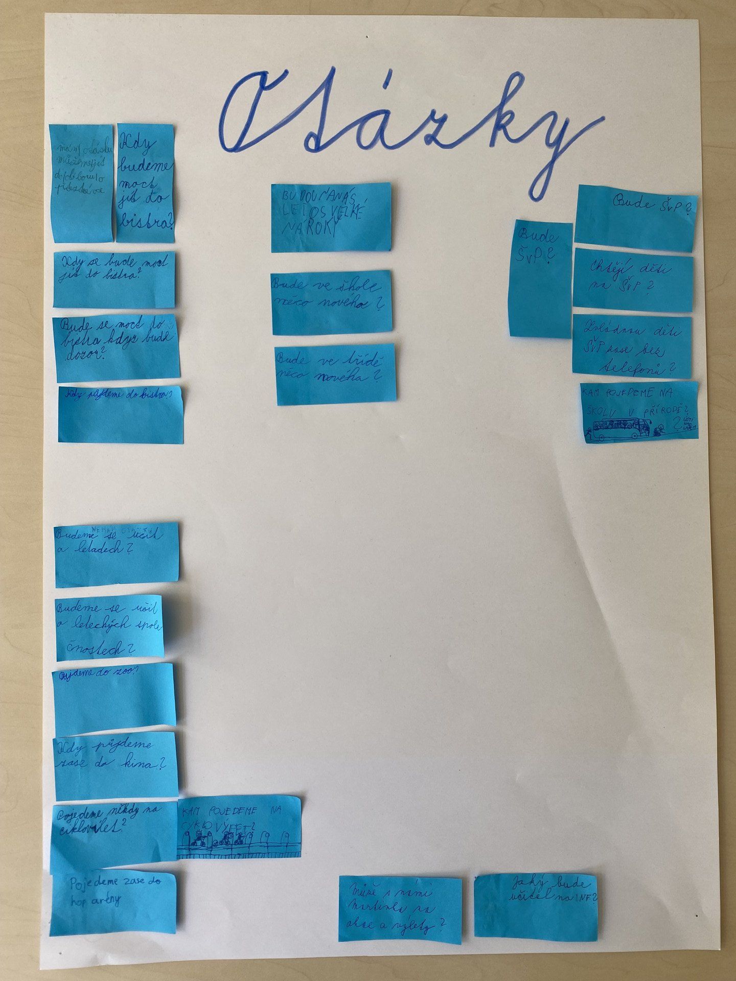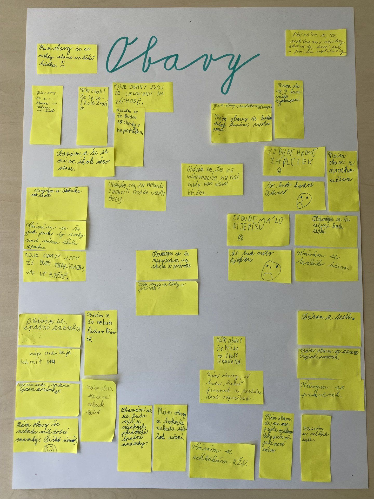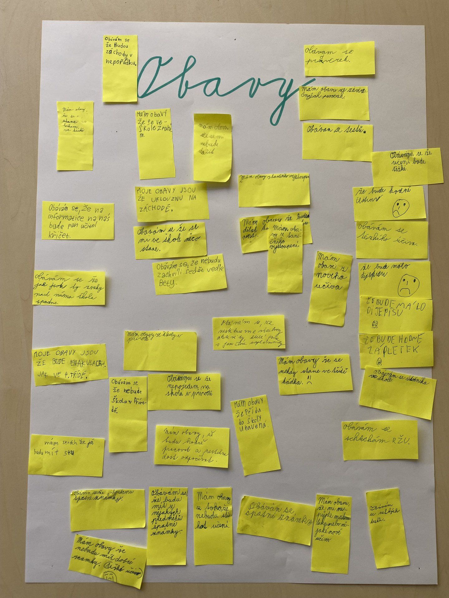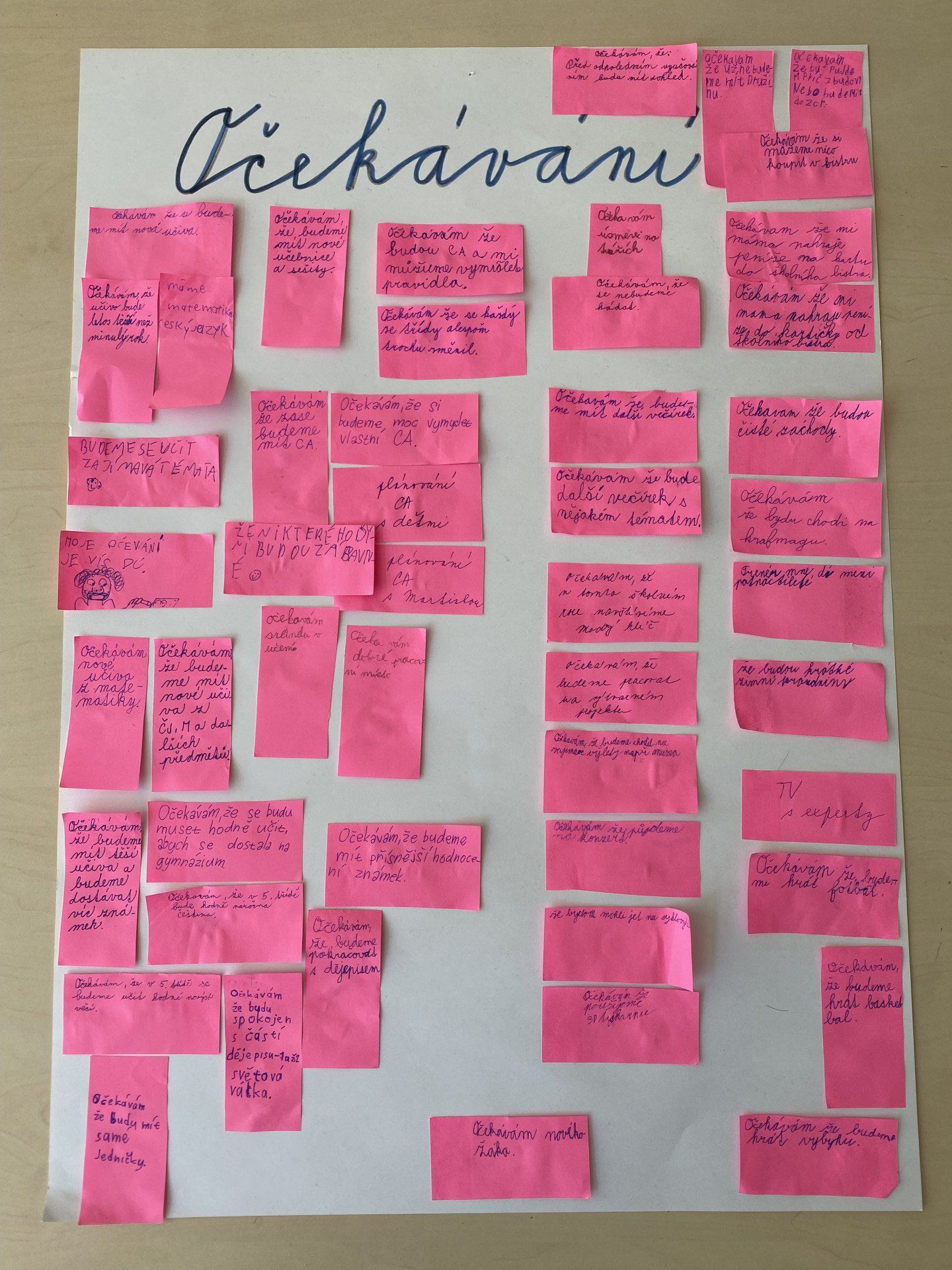 Na začátku bylo nejvíc otázek, mnoho jsme jich odpověděli hned. Přišla úleva. Při sdílení obav děti odhalily, že se obávají obdobných věcí či situací. Došlo k ujištění, že je možné vždy získat pomoc a podporu od druhých a že společnými silami školní rok zvládneme. Očekávání probudila zájem o učivo, akce a společné zážitky v novém roce.