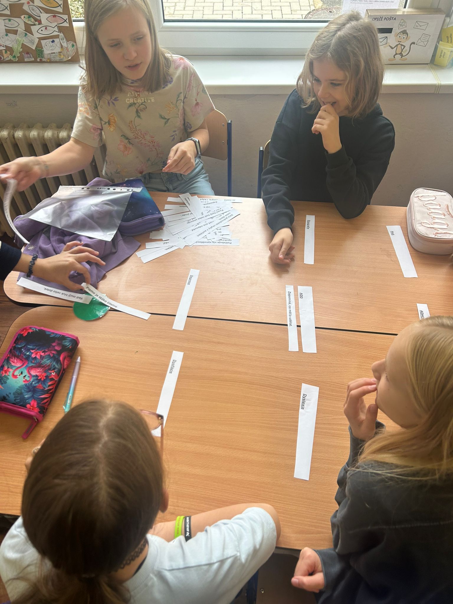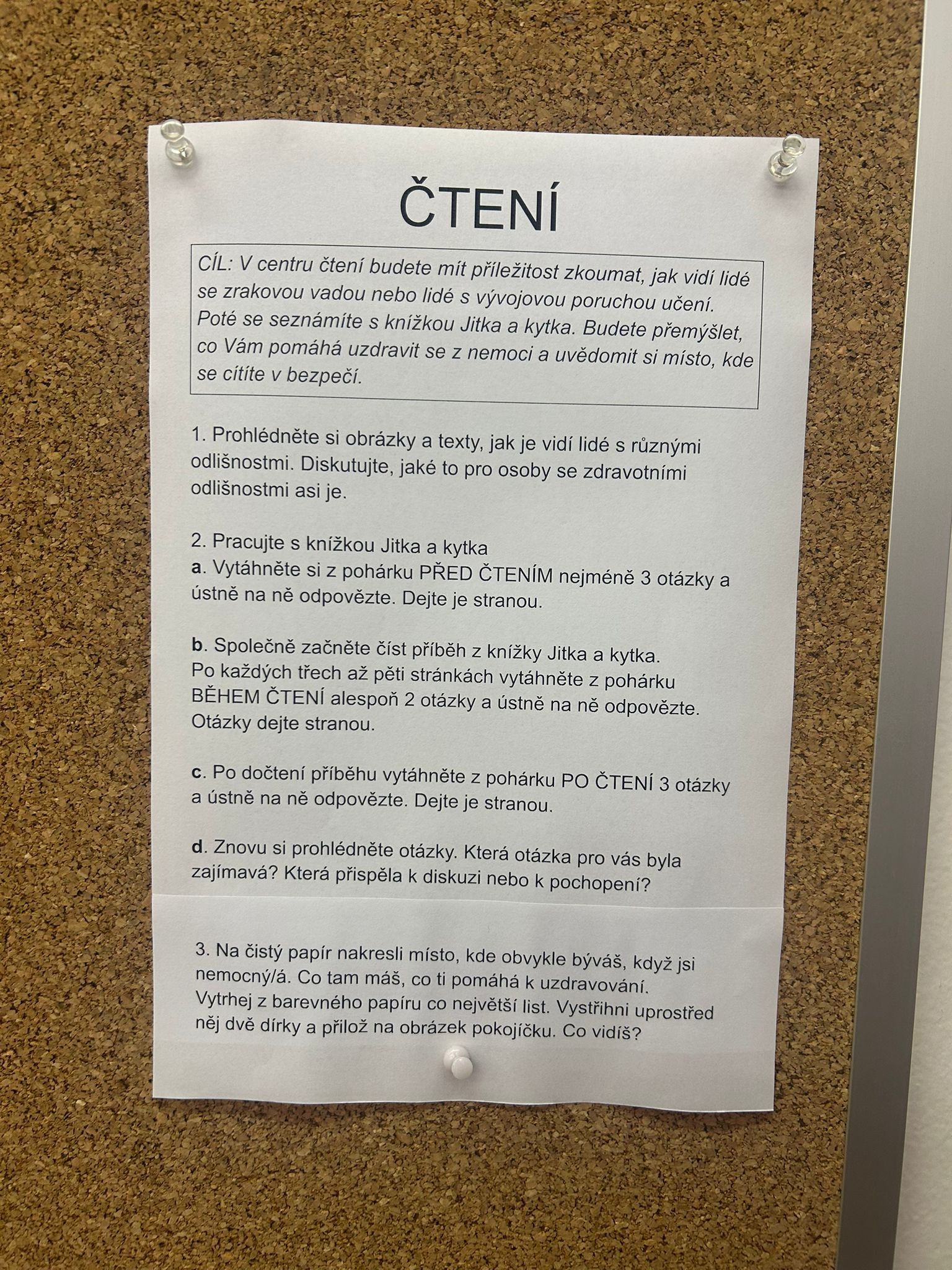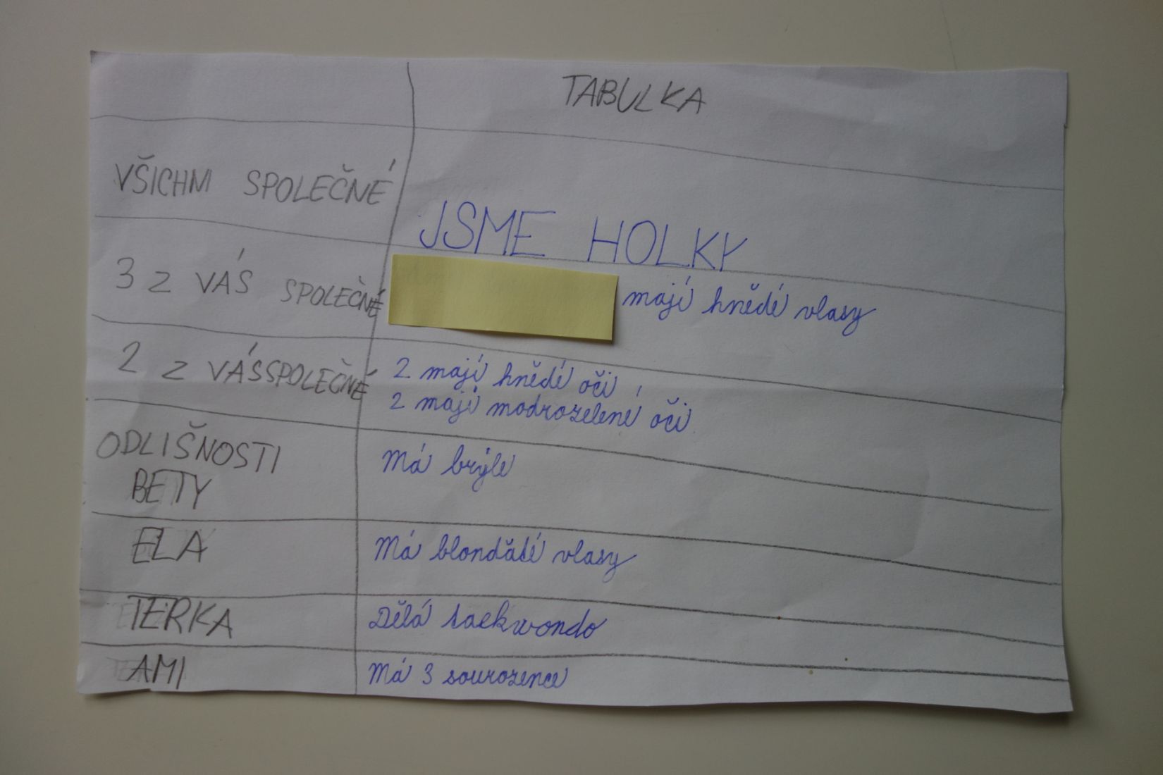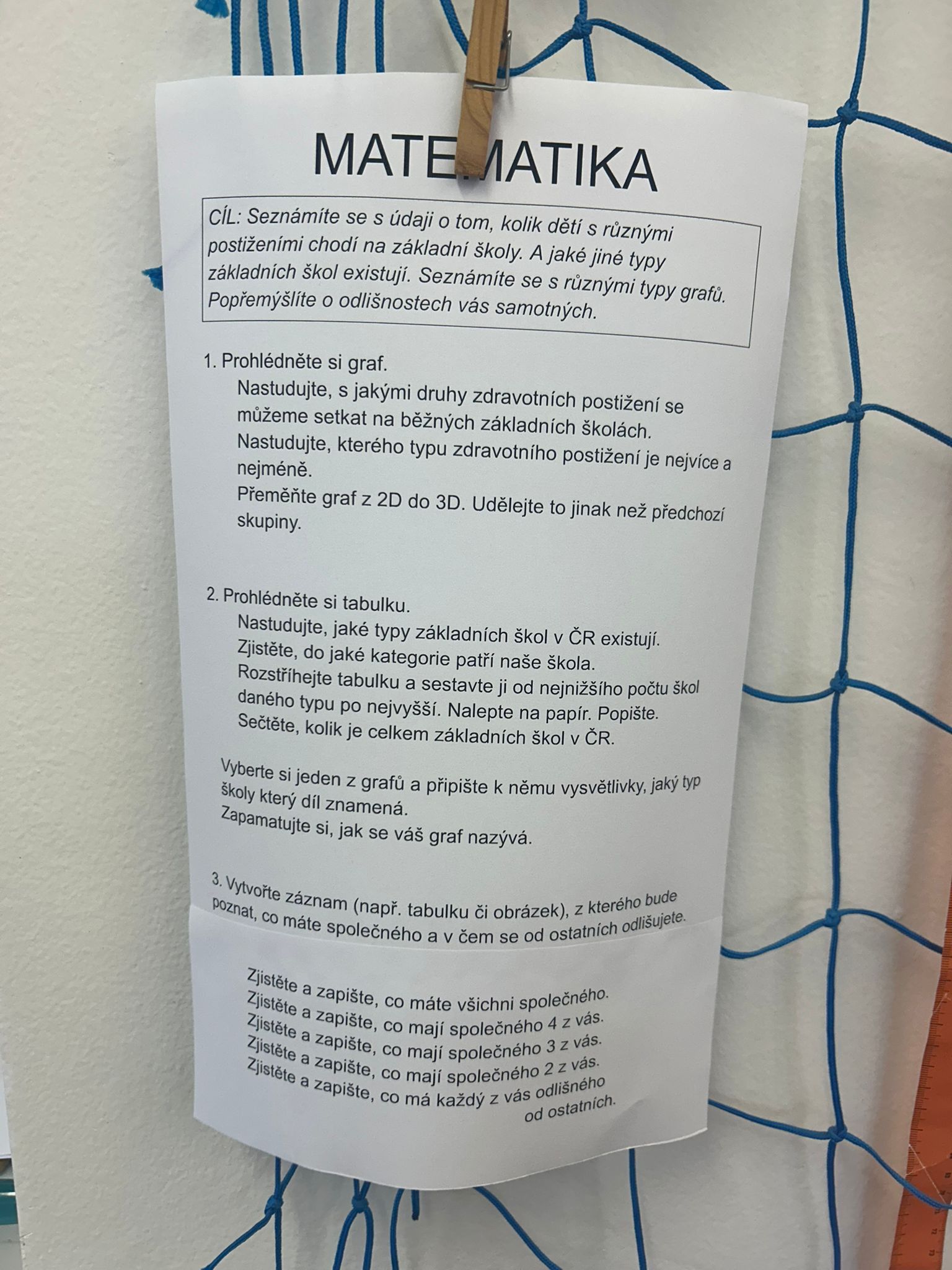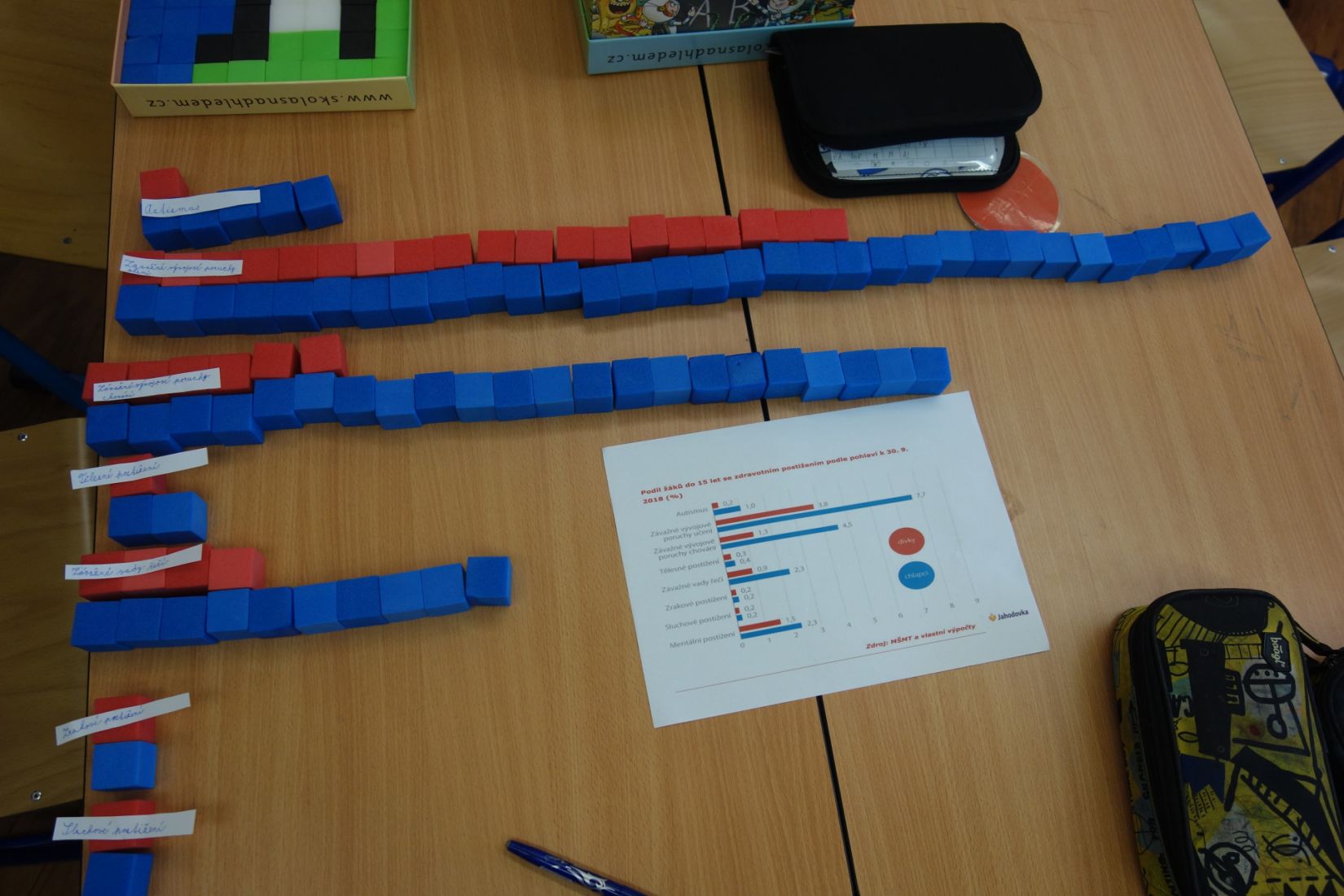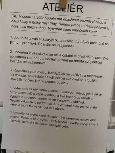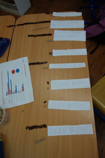 Ve vědách a objevech jsme prozkoumali nejrůznější poruchy učení a navrhovali, jak můžeme dětem s takovou poruchou pomáhat. V ateliéru jsme testovali, zda se dobře známe a pokusili jsme se nakreslit portrét někoho druhého. Ve psaní jsme zkoušeli psát diktát rušeni nejrůznějšími podněty, např. hlukem, dotykem, obrazem. Ve čtení jsme četli příběh o nemocné dívce a malovali místo, kde můžeme bezpečně stonat. V matematice jsme se seznamovali s typy škol. Převáděli jsme data z tabulek do různých typů grafů.