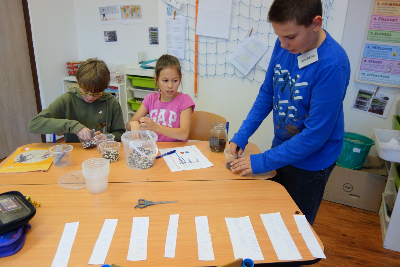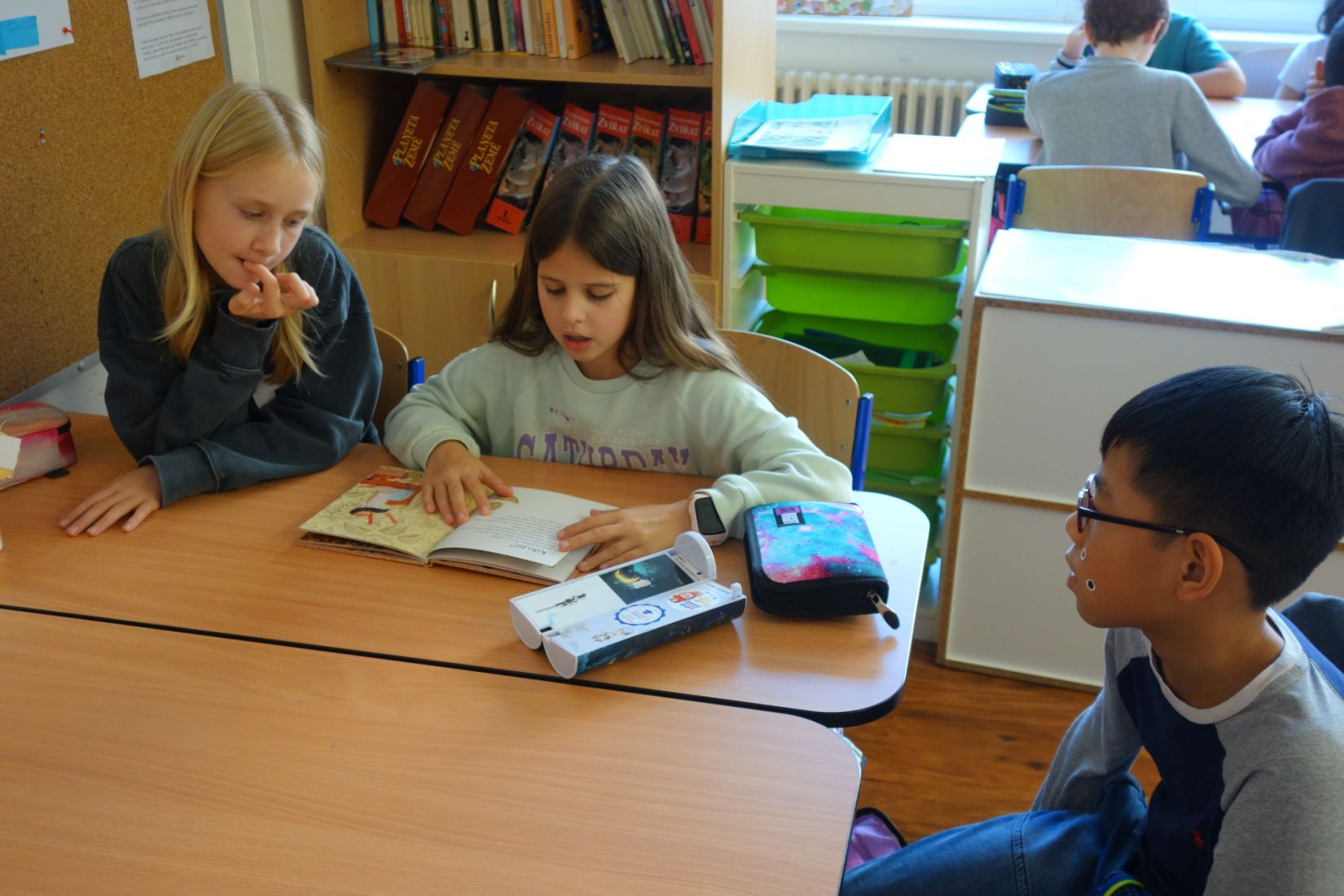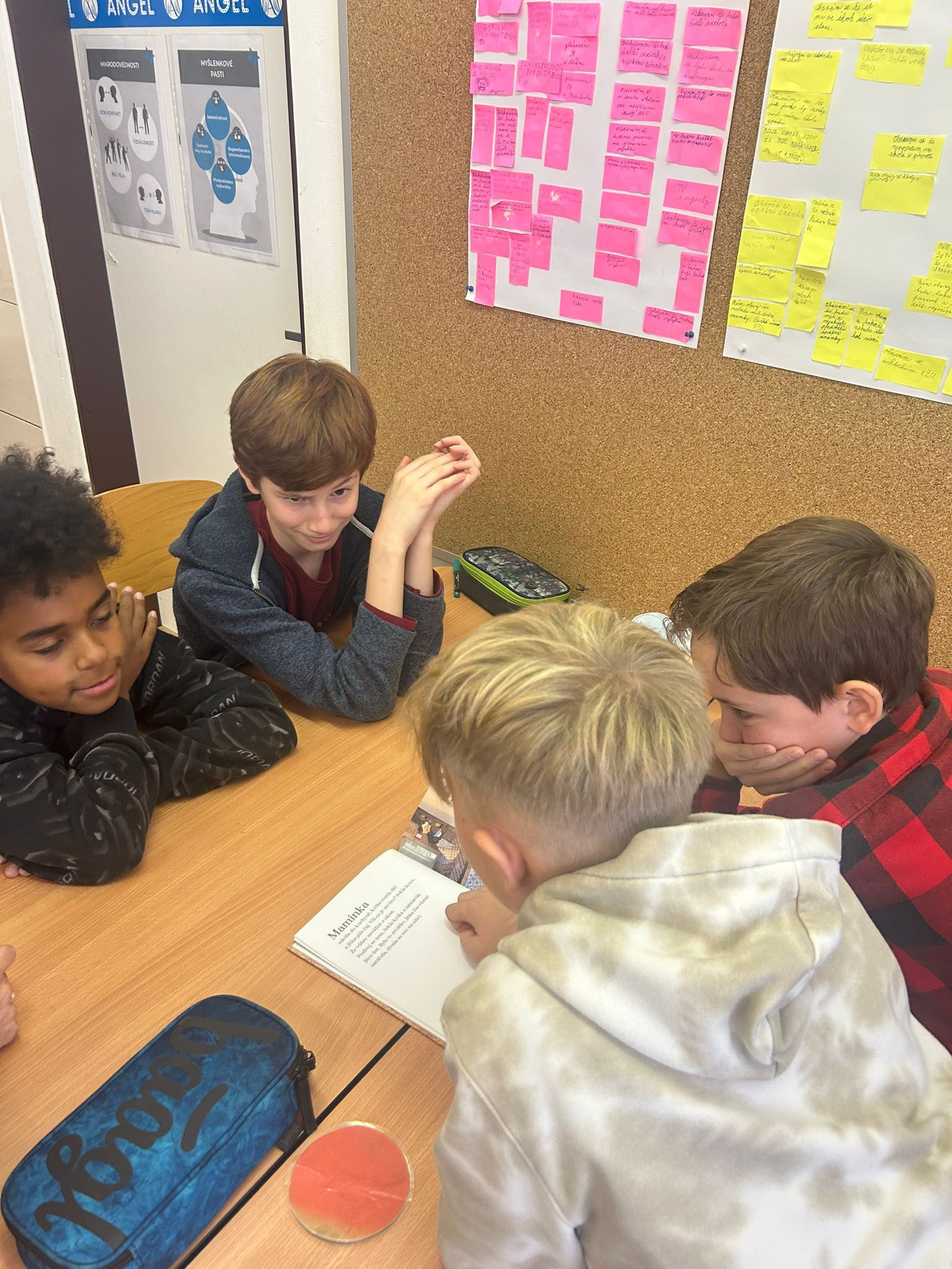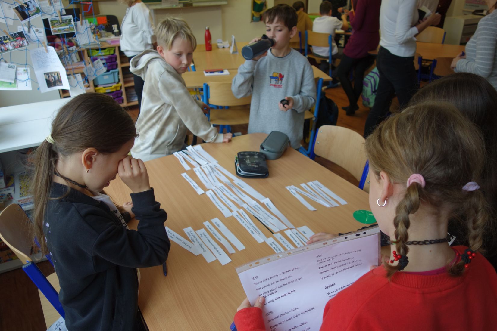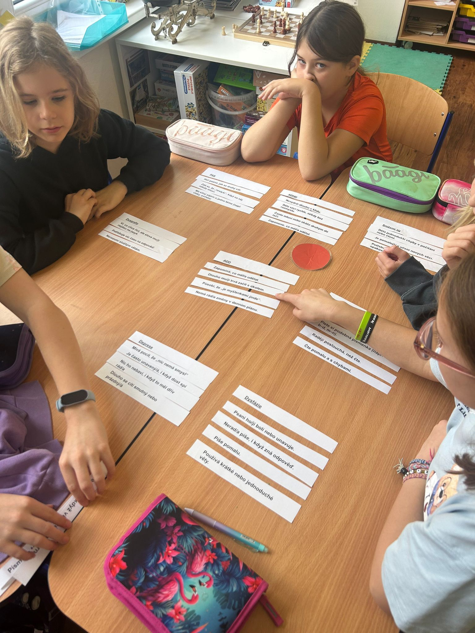 Ve vědách a objevech jsme prozkoumali nejrůznější poruchy učení a navrhovali, jak můžeme dětem s takovou poruchou pomáhat. V ateliéru jsme testovali, zda se dobře známe a pokusili jsme se nakreslit portrét někoho druhého. Ve psaní jsme zkoušeli psát diktát rušeni nejrůznějšími podněty, např. hlukem, dotykem, obrazem. Ve čtení jsme četli příběh o nemocné dívce a malovali místo, kde můžeme bezpečně stonat. V matematice jsme se seznamovali s typy škol. Převáděli jsme data z tabulek do různých typů grafů.