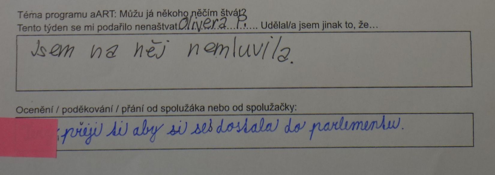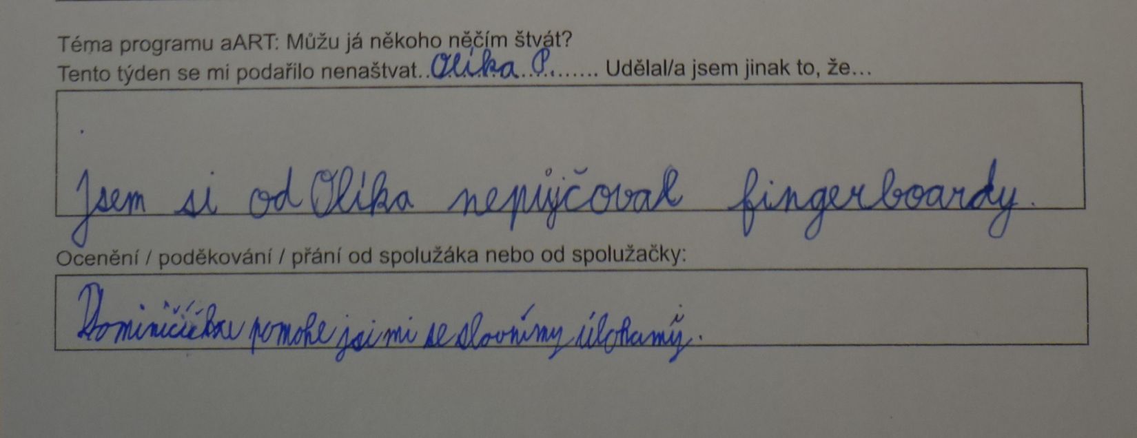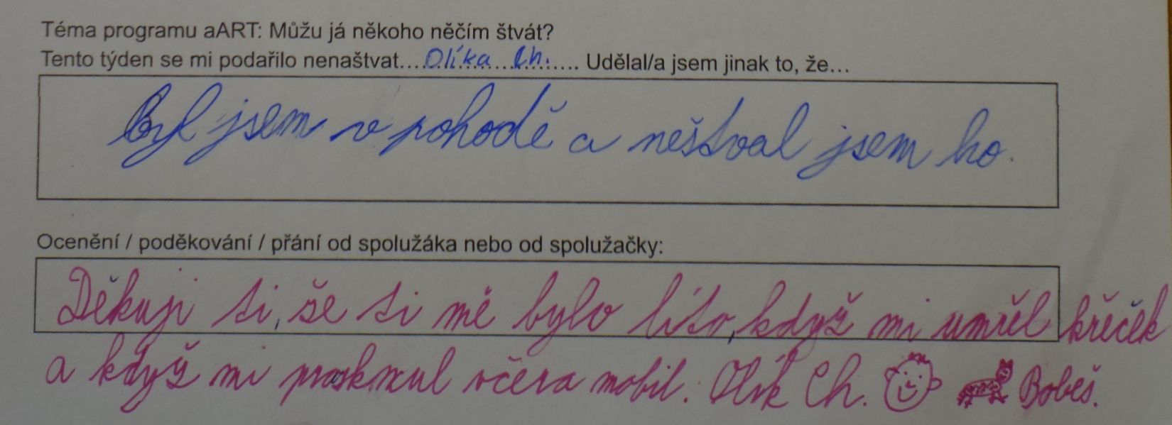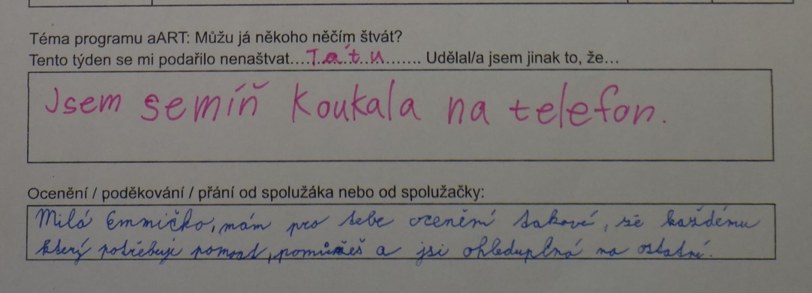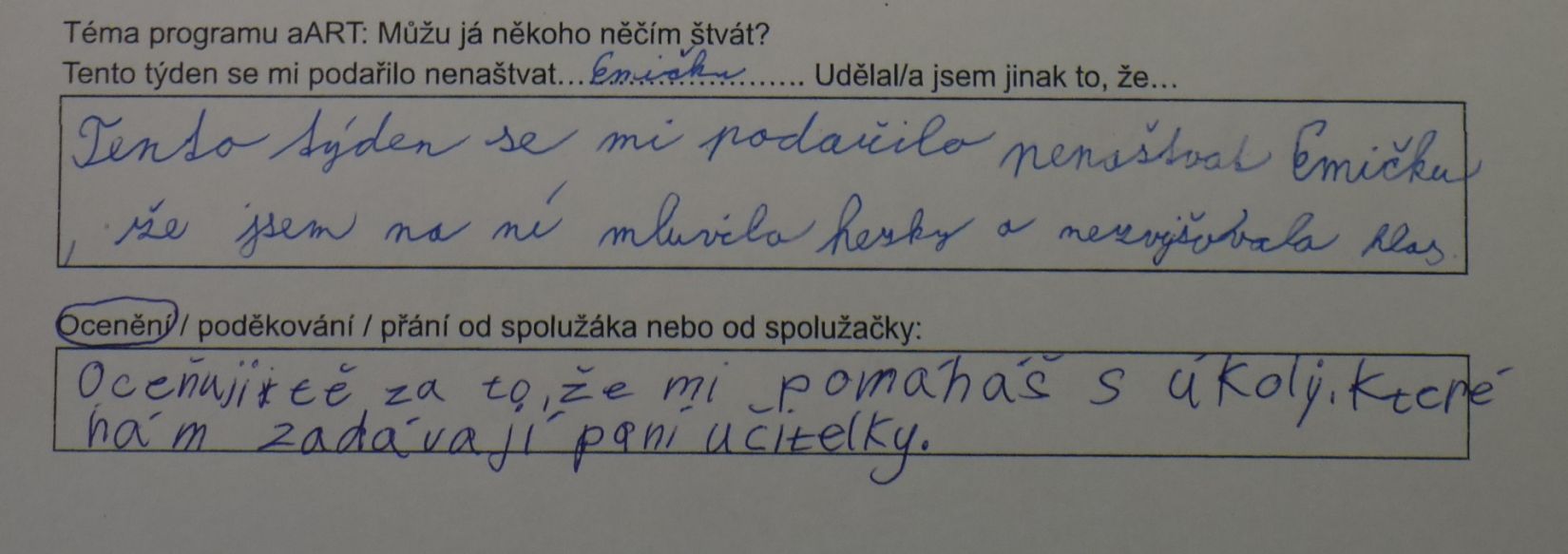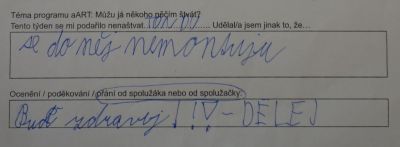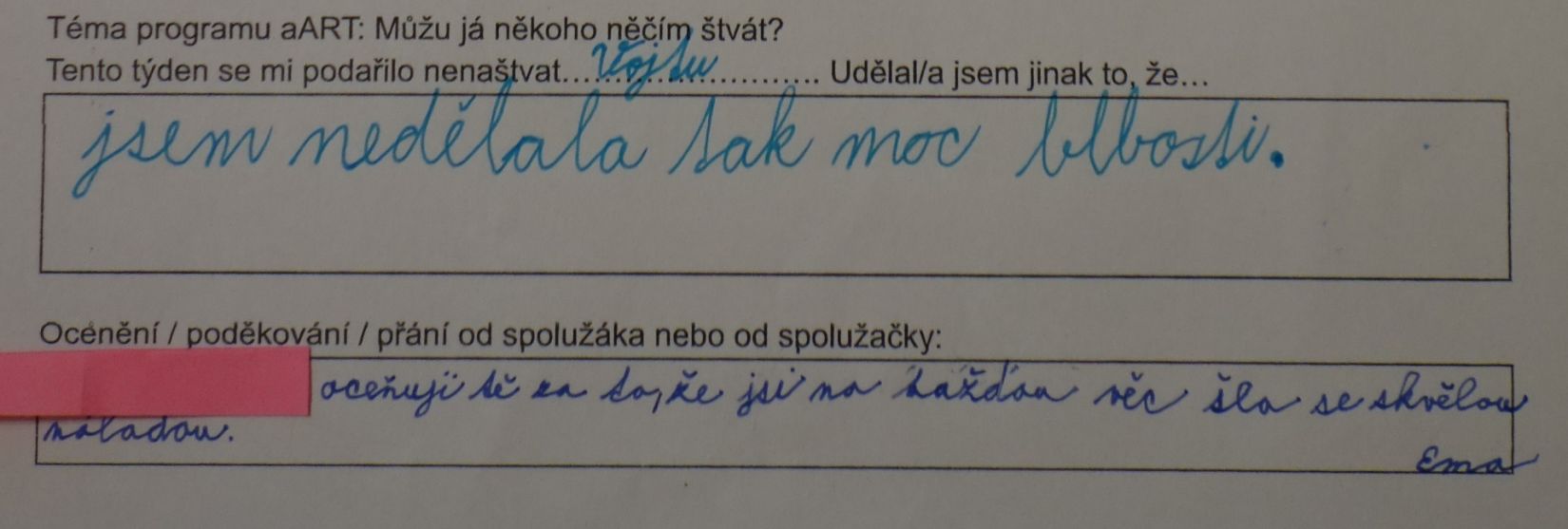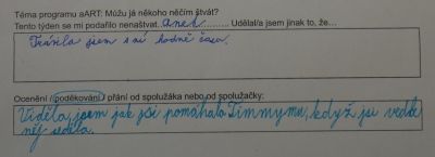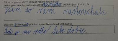 V tomto případě šlo o zamyšlení po absolvované lekci aART. Jaký měla lekce dopad? V mnoha případech došlo k úpravě chování mezi dětmi nebo i v rodině tak, aby nedošlo ke konfliktu, aby se zúčastněné strany mohly cítit v pohodě.