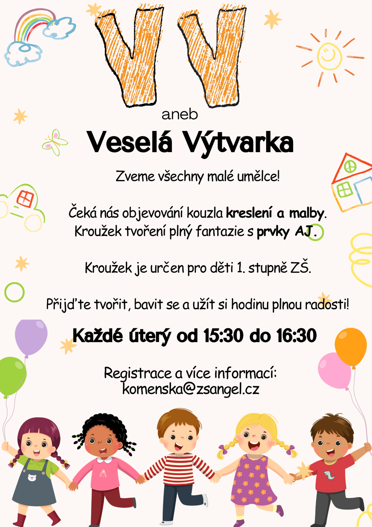 nabízíme Vašim dětem nový výtvarný kroužek VV aneb Veselá Výtvarka s prvky AJ, určený pro děti 1. stupně ZŠ.